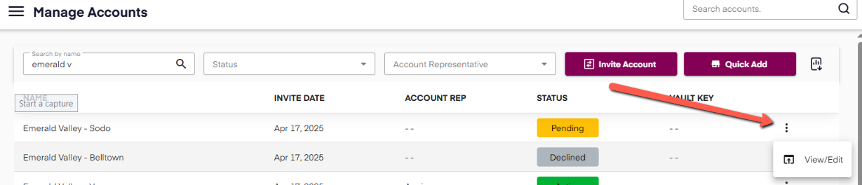 From the Manage Accounts dashboard, filter your store connections to active stores only and click on the three vertical dots next to the store for the account you wish to edit: