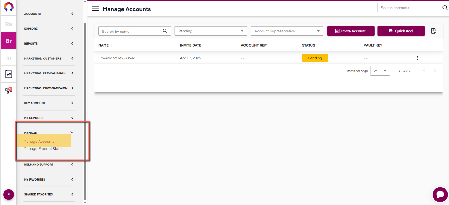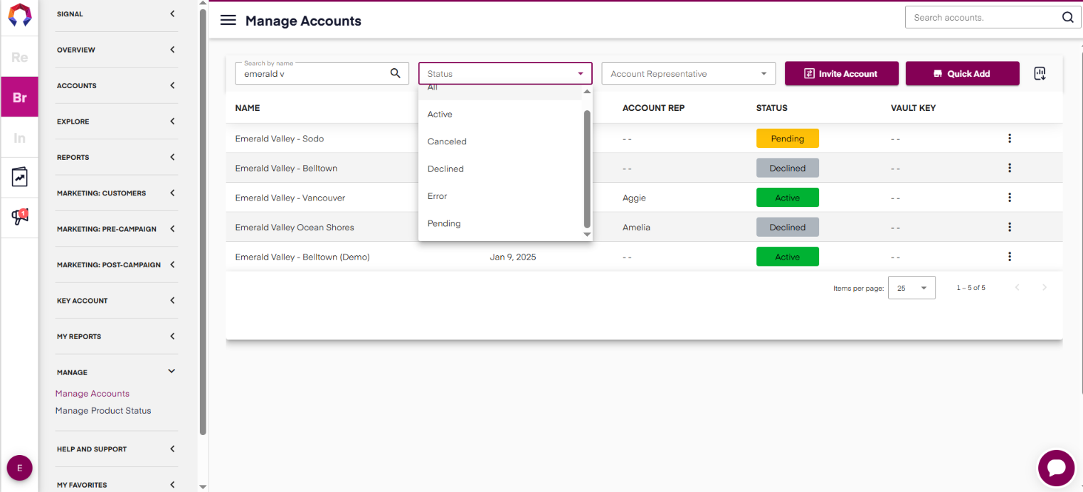 From the Manage Accounts dashboard you can view all of your invitations to Retailers and their current status.